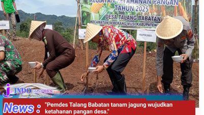 INDO EKSPRES.com – Kepahiang, Pemerintah Desa Talang Babatan, Kecamatan Seberang Musi, Kabupaten Kepahiang, melaksanakan program ketahanan pangan melalui penanaman jagung di lahan kosong seluas 2 hektare yang terletak di belakang kantor desa. Kegiatan ini dilaksanakan pada Kamis, 17 April 2025.